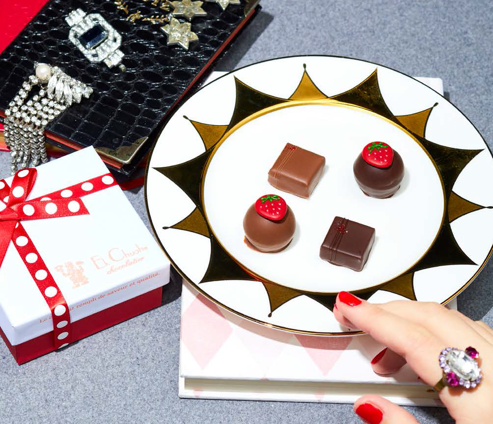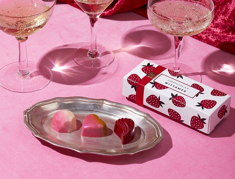 いちごと相性のよい素材をかけ合せた味わいの異なる3種のショコラ。キラキラ輝くカラフルな見た目も華やか。