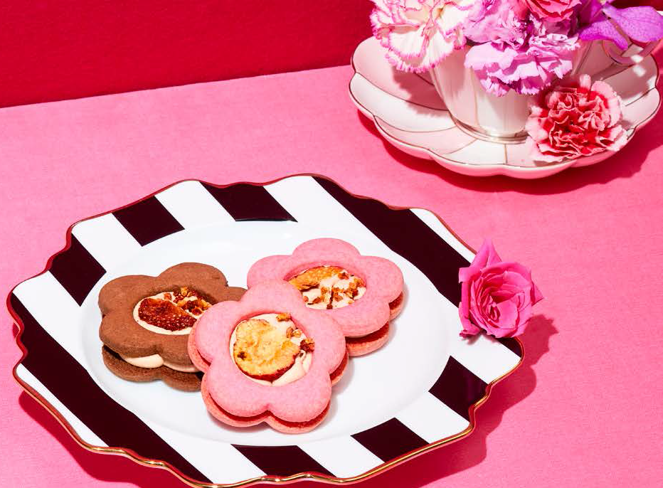 花型のかわいいサブレでクリームをサンド。真ん中にはフリーズドライのいちごをトッピング。