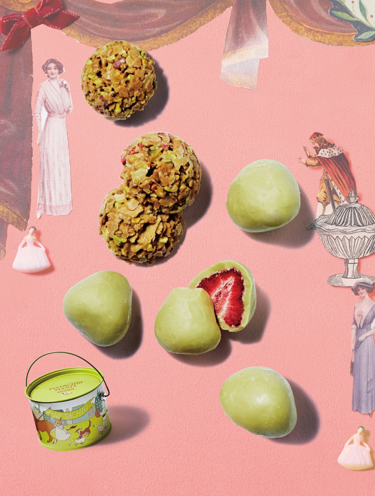 フリーズドライのいちごとオリジナルレシピのピスタチオチョコを組合せ、食感の違う2種の味わいに。