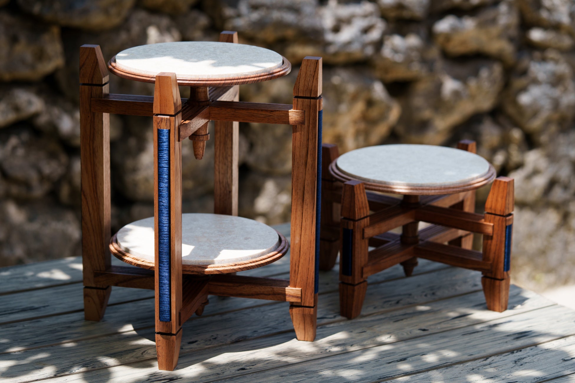 ティースタンドは、竹富島の風土を表現したデザインです。木材は軽量で耐久性のあるセンダンを使用し、側面には竹富島発祥の伝統工芸品である「ミンサー織り」をモチーフにした糸があしらわれています。さらに、プレート部分には琉球石灰岩を使用し、珊瑚礁が隆起して誕生した竹富島の地質を表現しています。優美な外観だけでなく、細部に竹富島のストーリーを織り交ぜたこだわりのティースタンドです。