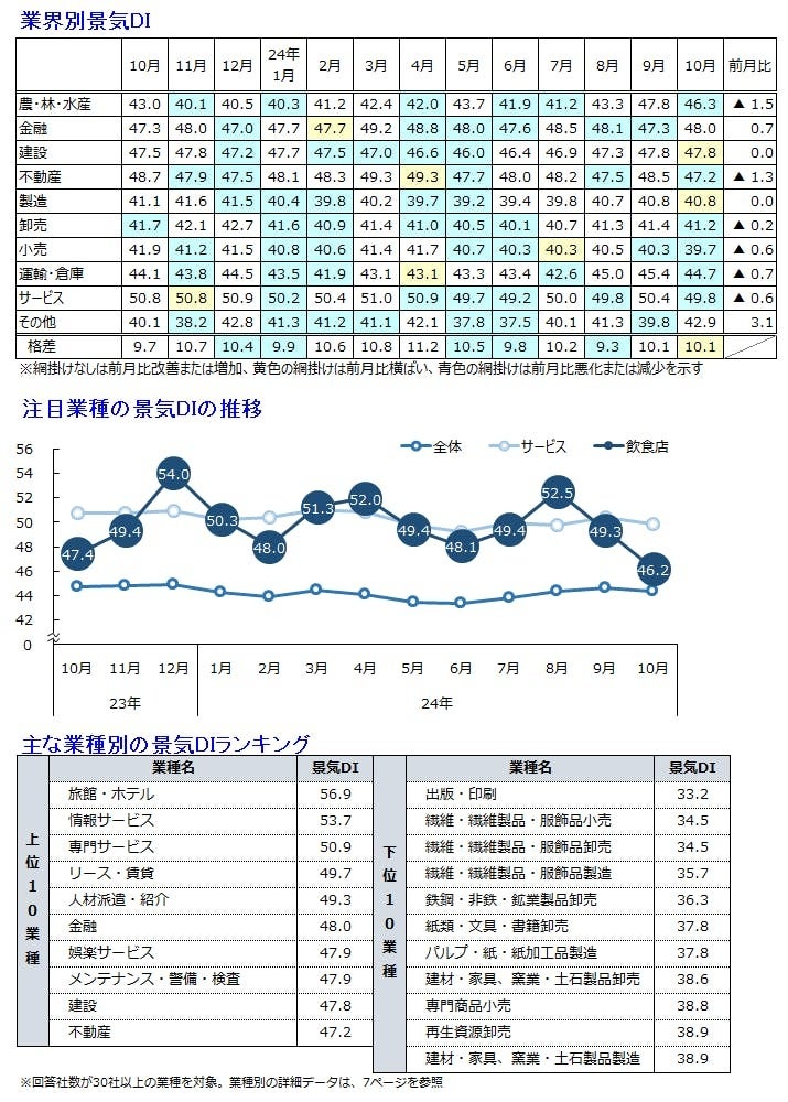 『サービス』『小売』など10業界中6業界が悪化、全業界で50を下回った。飲食料品やアパレルなどを中心に個人消費が停滞、特に『小売』は1年8カ月ぶりに30台に低下した。他方、防災・災害復旧工事、自動車生産の復調などは押し上げ要因だった。