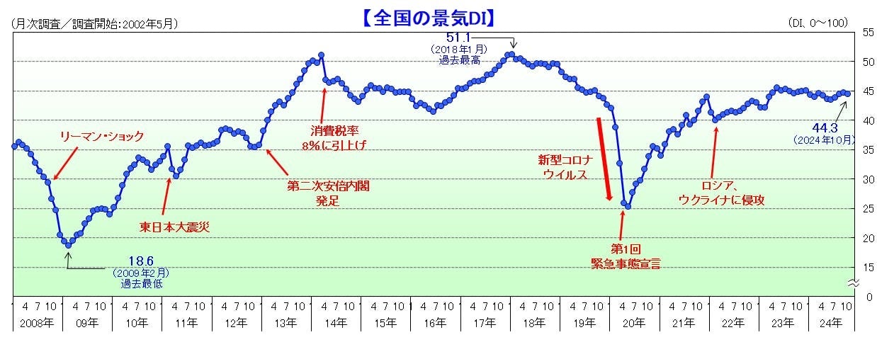2024年10月の景気DIは前月比0.3ポイント減の44.3となり、4カ月ぶりに悪化。