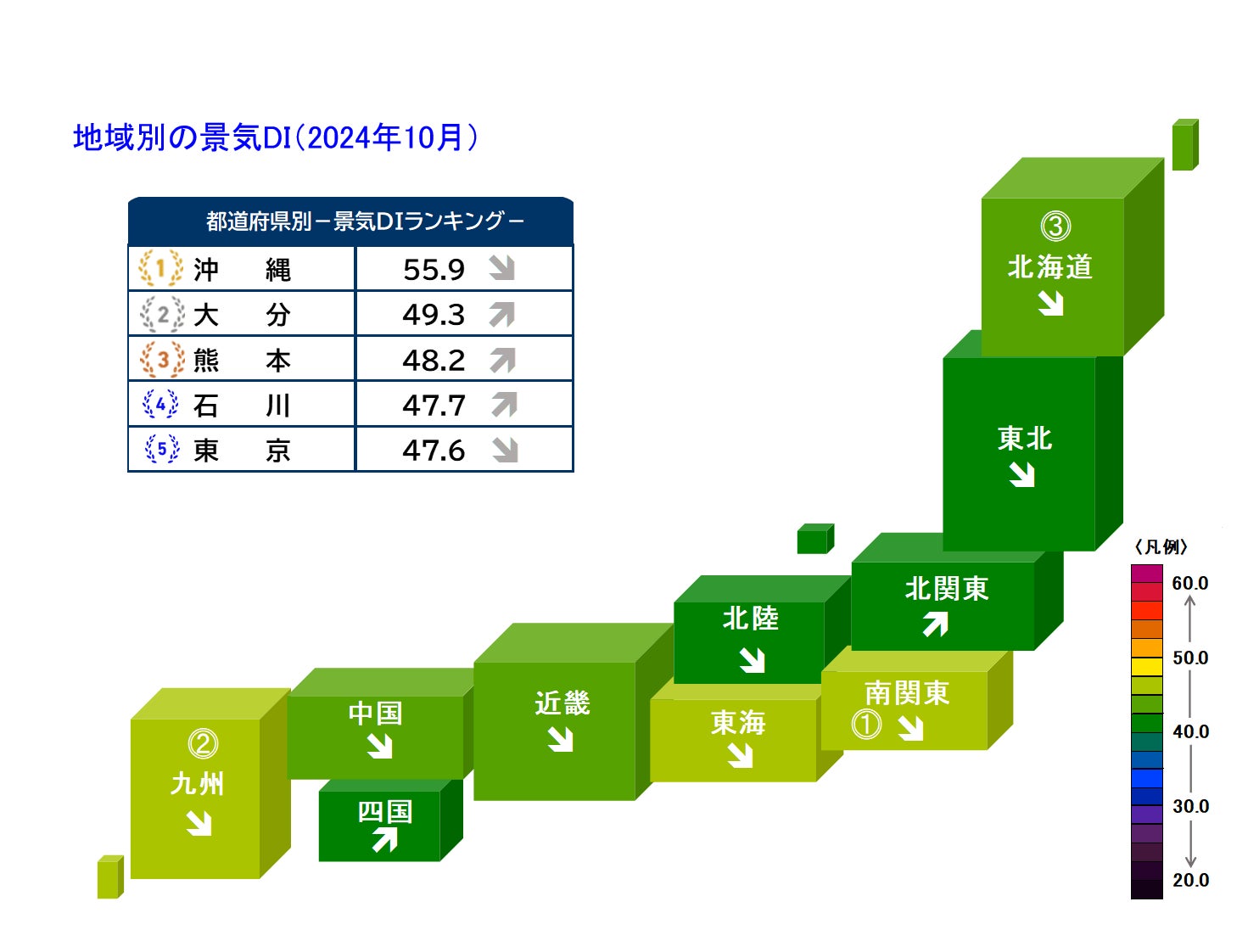 『北海道』『近畿』など10地域中8地域が悪化、『四国』と『北関東』の2地域が改善した。都道府県別では27都道府県が悪化、19府県が改善。観光需要が伸び悩んだことに加え、季節需要や公共工事の低迷が一部の地域経済で下押し要因となった。