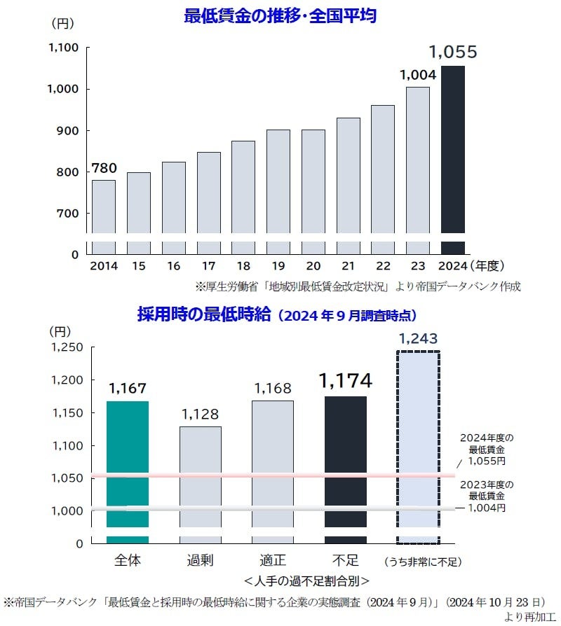 採用時の最低時給は、平均1,167円、2024年改定の最低賃金を112円上回る。なお、人手不足企業では平均1,174円とさらに高く設定している