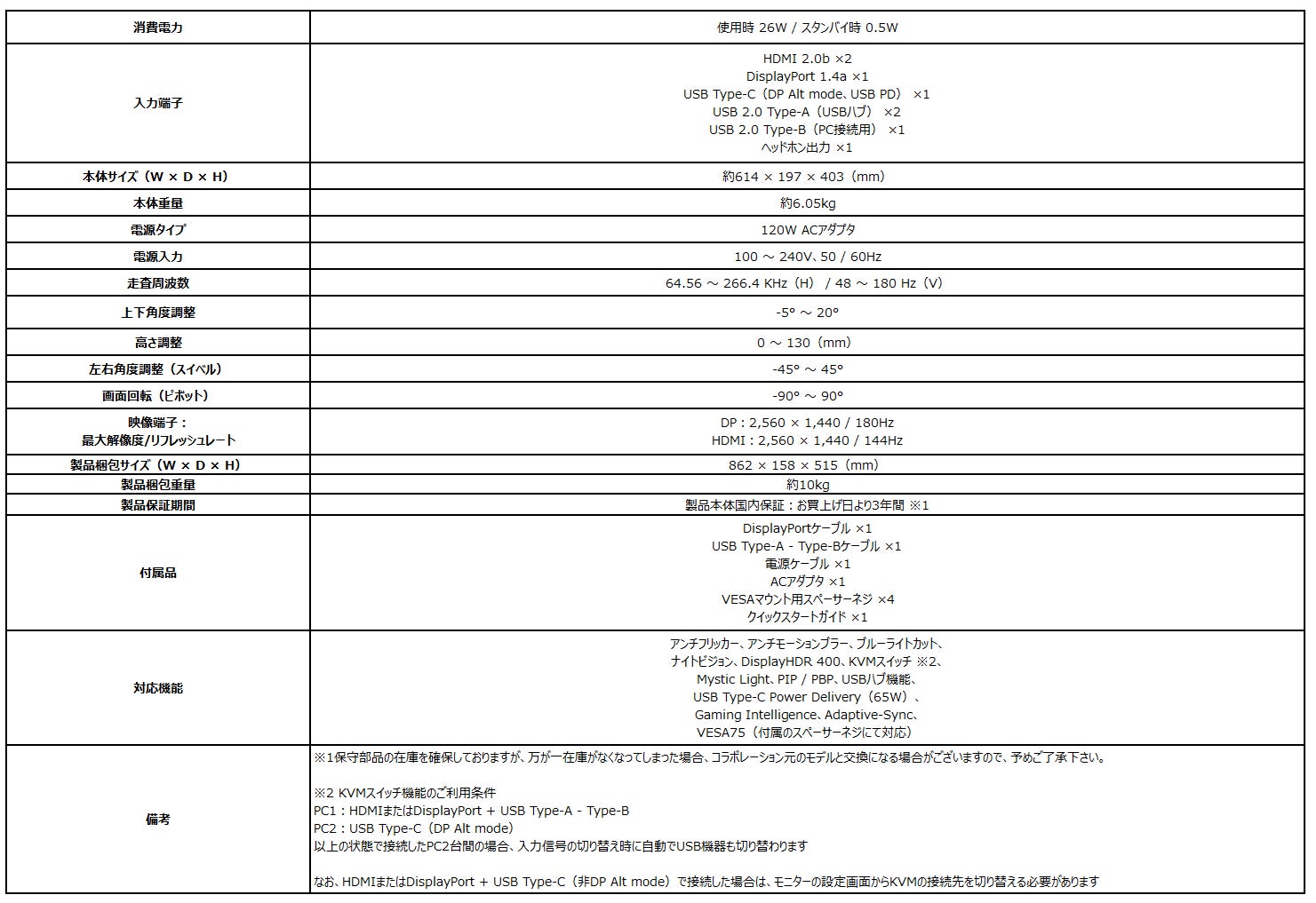 性能面では、人気の27インチ・WQHD・RAPID IPSで高画質と高いゲーミング性能の両立を実現し、快適にゲームプレイが楽しめます。さらに色純度の高い発色を可能にする量子ドット技術により、クリエイターモニター並みの広色域に対応しています。他にもUSB PD65WやKVMスイッチ、高性能スタンド、PC上からモニターの各種設定・プリセット登録が可能なGaming Intelligenceを搭載し、今回のコラボレーションに相応しいハイスペックモデルです。