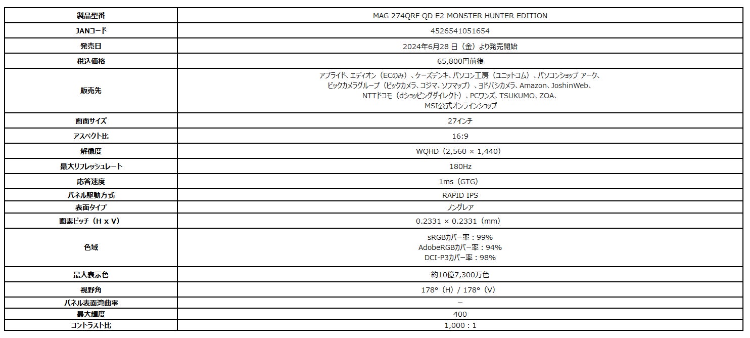 製品ページ: https://jp.msi.com/Monitor/MAG-274QRF-QD-E2-MONSTER-HUNTER-EDITION