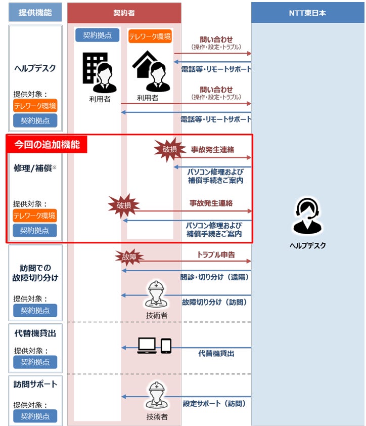 新プランは、お客さまのオフィスだけでなく在宅勤務等テレワーク環境のICT機器などに関する操作・設定・トラブルをサポートする現行機能に、パソコンの破損時等に生じる修理対応とパソコン修理費用を補償する機器補償を付帯しており、より広範なお客さまサポートを実現します。