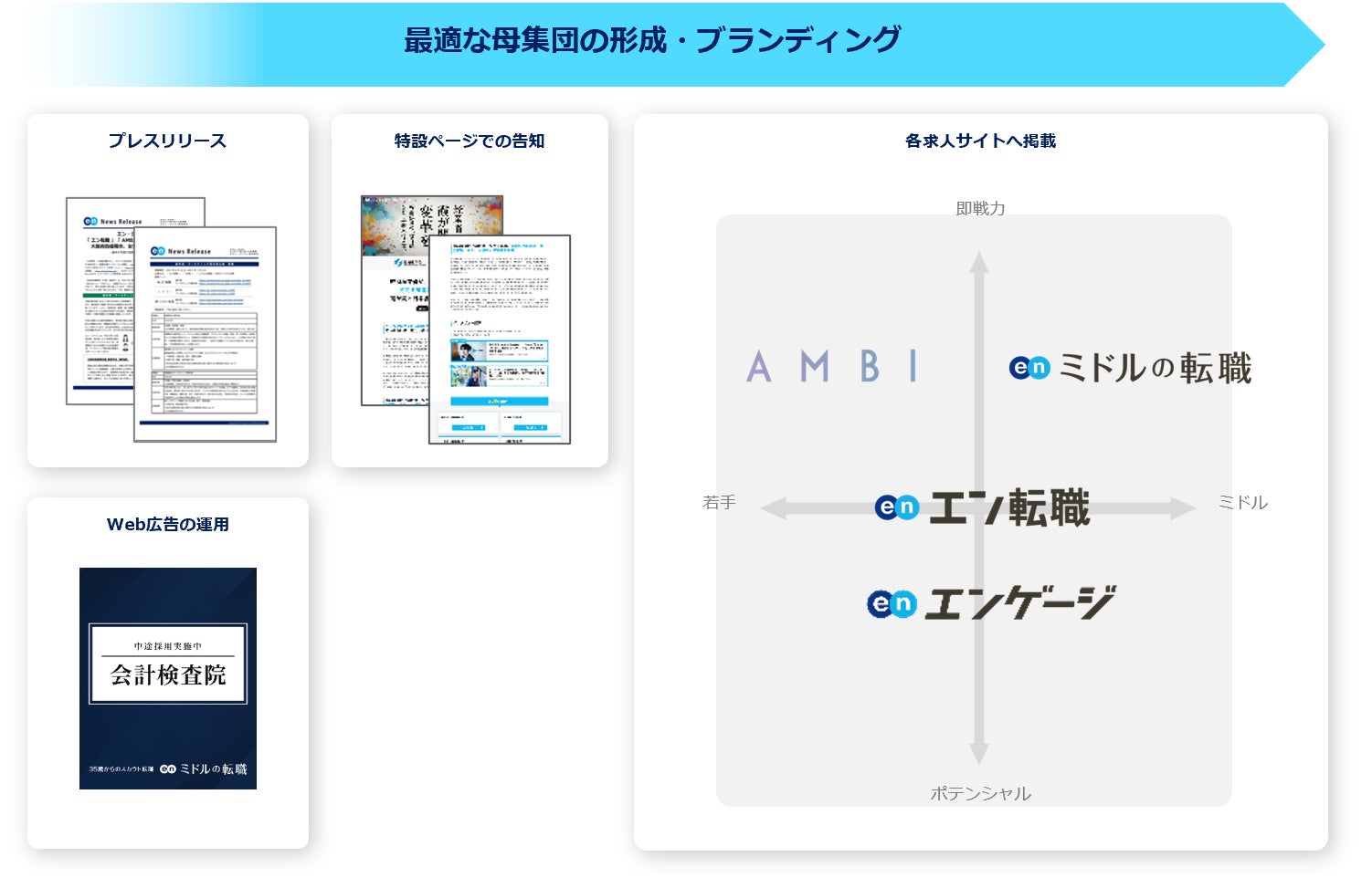 プレスリリースや特設ページ、Web広告での告知に加え、各求人サイトでの集客支援を実施。『エン転職』『エンゲージ』『AMBI』『ミドルの転職』とターゲットの異なる求人サイトを活用することで、ターゲットへ網羅的に求人を届けます。