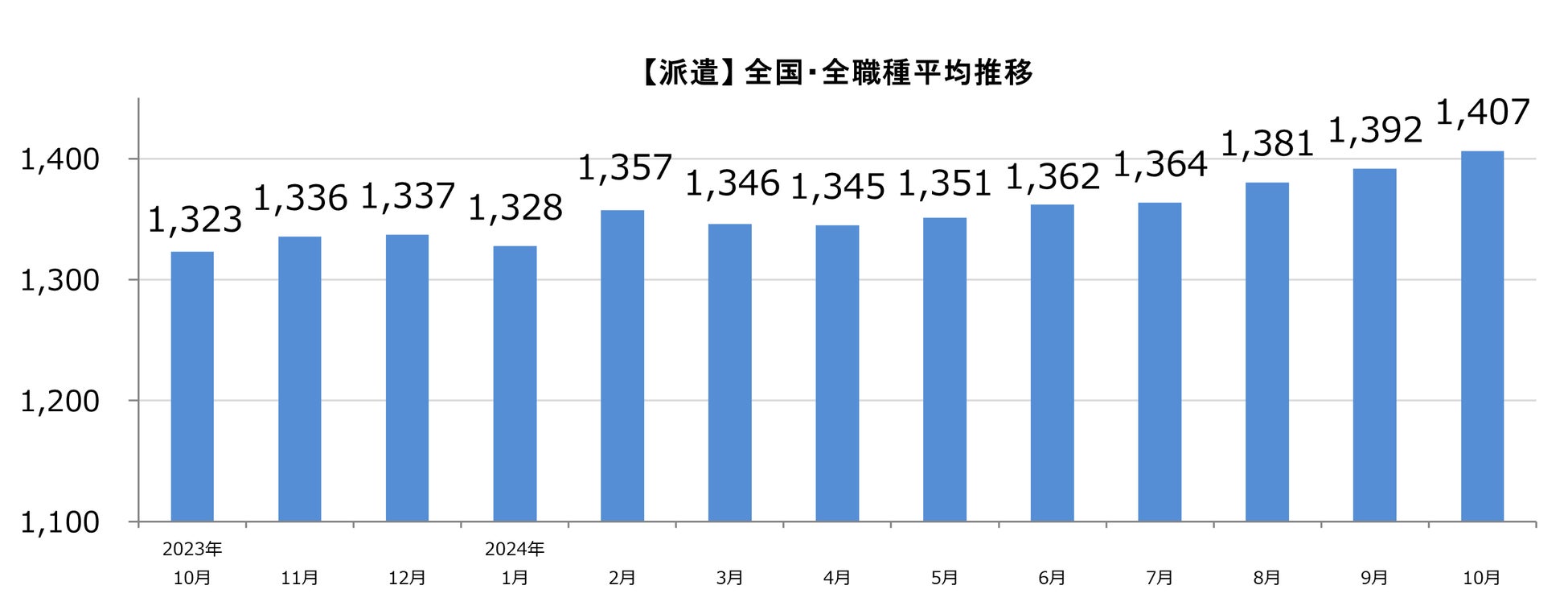 【派遣】全国・全職種平均時給は1,407円。前月比+15円。前年同月比+84円