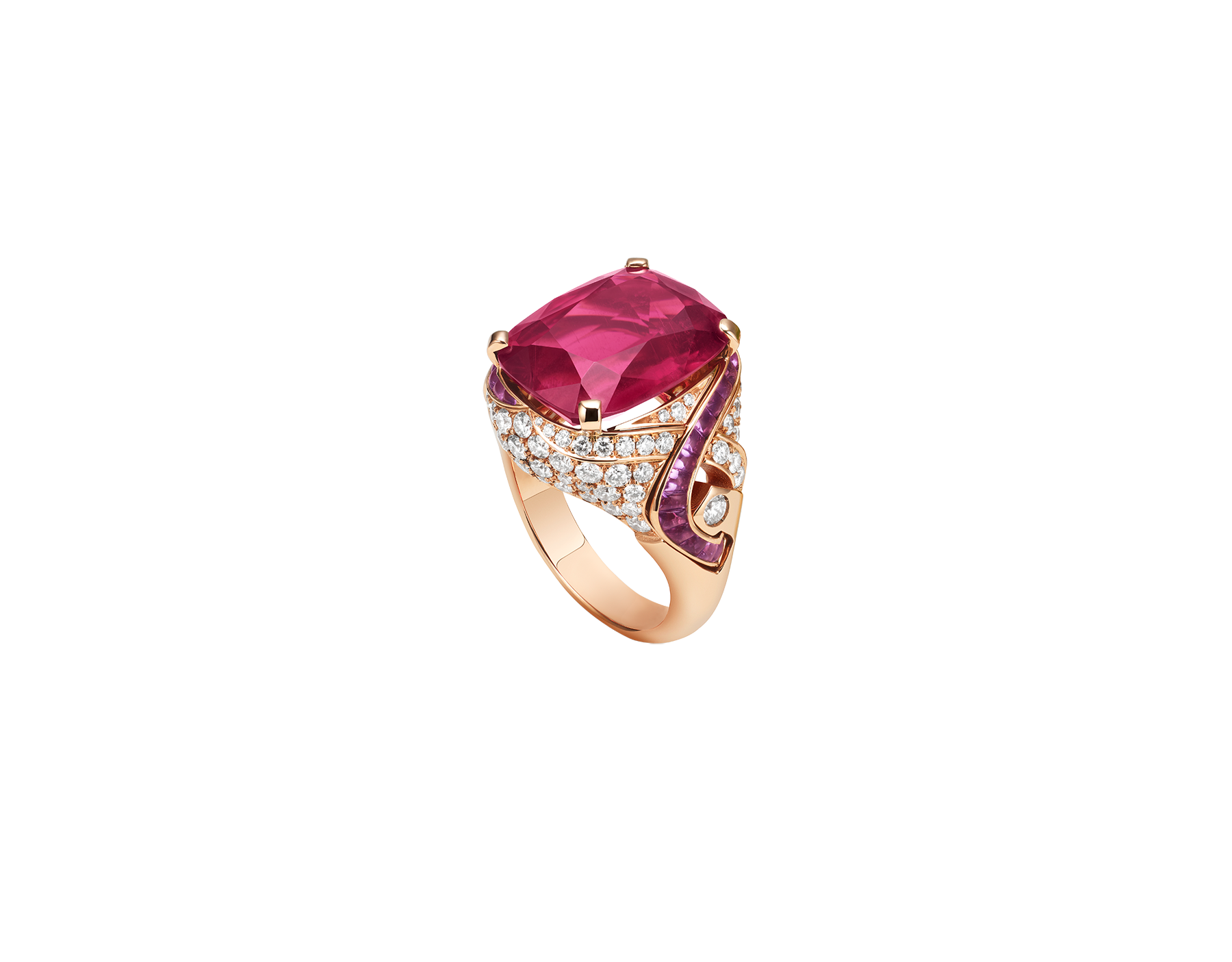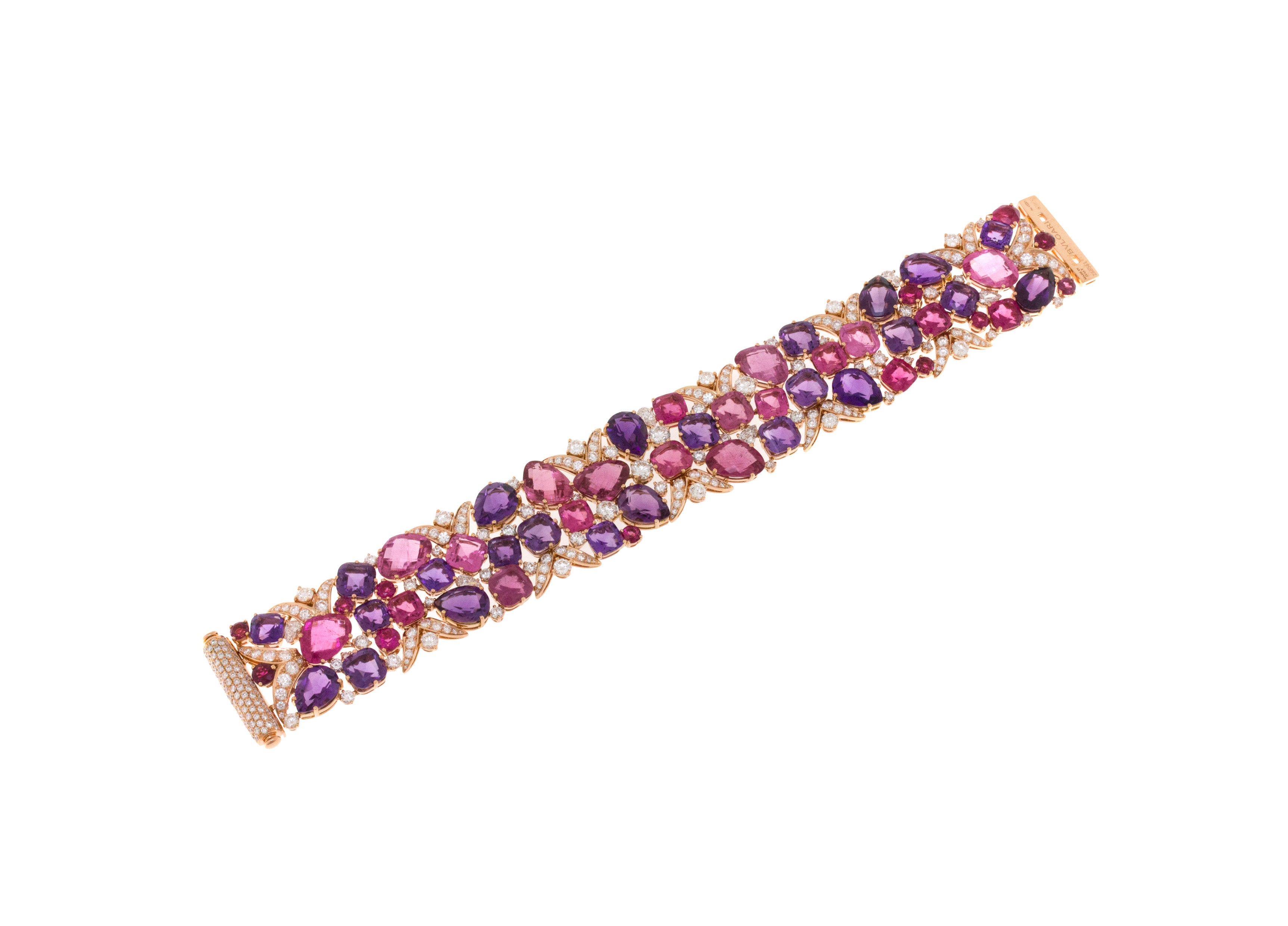 またカーラの指を飾るのは、お揃いのカクテルブーケリング。目を見張る色合い、刺激的な色の組み合わせ、大胆なボリューム感が、比類ないクラフツマンシップによって一体化されています。このリングは、10,95カラットのクッションカットのルベライトを中心にバフトップアメシストとパヴェセッティングダイヤモンドで巧みに装飾されたボリューム感のあるセッティングが宝石の周りを流れるように配置されています。スタイリングのファイナルタッチの腕元には、エレガントなブルガリのブレスレットを合わせました。