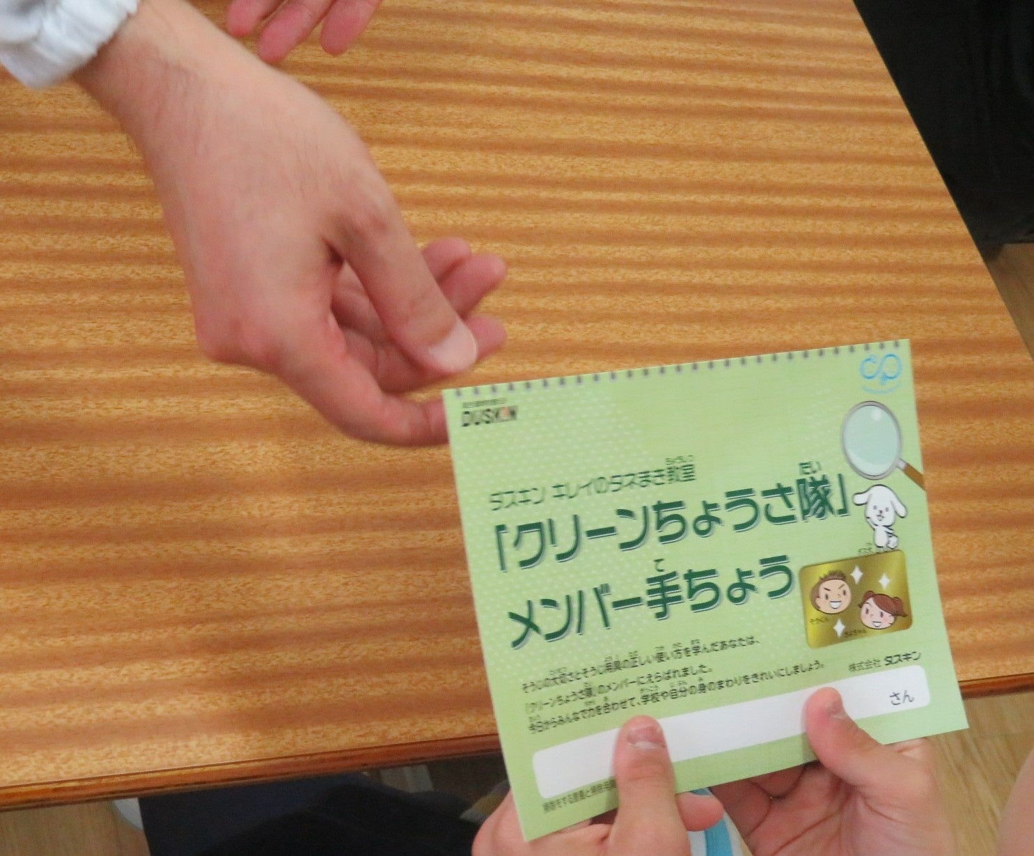 普段の授業では見せない生徒の表情や行動などを見ることができた新鮮な授業でした。最後に『クリーンちょうさ隊 メンバー手ちょう』を手に持った生徒の顔がパッと明るくなる様子を見て、各々自信がついたと感じられました。お掃除への関心が高まり、より楽しく実践してくれると思います。