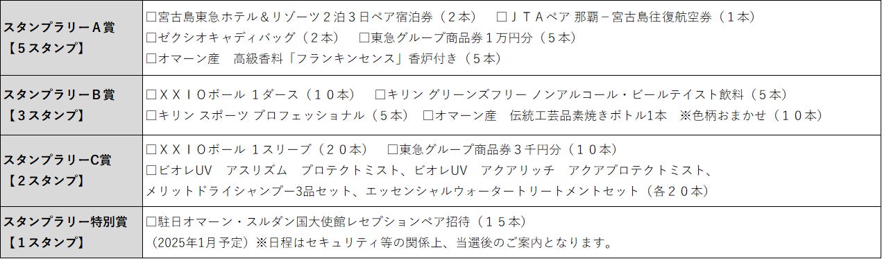 日本国内の地区イベントの参加者には、参加賞として全員に、特別協賛各社(キリンビール株式会社、キリンビバレッジ株式会社)の飲料と、花王株式会社のビオレ、メリットの商品をプレゼントします。この他、1ラウンド(18ホール)ごとにスタンプを貯めて、豪華賞品に応募できるスマホスタンプラリー(※2)やInstagramキャンペーンを同時開催します。スタンプラリー賞品には、宮古島東急ホテル&リゾーツペア宿泊券やゴルフ用品、駐日オマーン・スルタン国大使館レセプション招待や高級香料フランキンセンスなどをご用意しています。