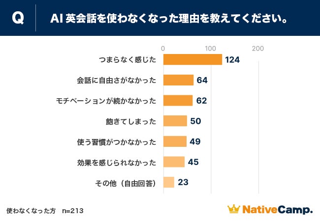 使わなくなった理由では、「つまらない」「飽きた」といった“楽しさの欠如”に関する回答が多数を占めました。AI英会話が「便利」でも、「続けたい」と思える体験にはまだ課題があるようです。