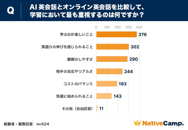 学習者が最も重視しているのは「学ぶ楽しさ」と「英語力の伸び」。AIは効率的な練習相手として役立つ一方で、“リアルな反応”や“対話の臨場感”を求める声が多く挙がりました。