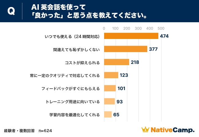 AI英会話は「いつでも使える」「間違えても恥ずかしくない」といった手軽さや心理的安心感が高く評価されました。また、「反復練習」や「文法チェック」といったトレーニング用途での有効性も一定数見られました。