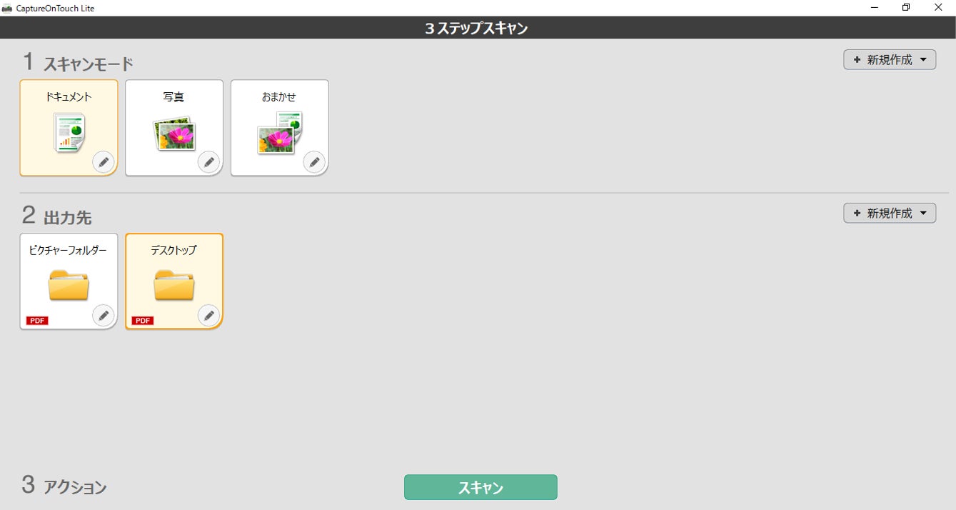 スキャンをより効率よく行うためのソフトウエア「CaptureOnTouch Lite(キャプチャーオンタッチライト)」を搭載しており、①スキャンモードの選択②出力先の選択③スキャンの実行の3ステップで操作が可能です。データを保存する前にプレビュー画面での確認/修正が可能なため、作業をやり直す手間を削減します。また実用性の向上のため、白紙スキップや原稿の傾きの自動補正などよく使う設定をあらかじめ登録しており、起動後すぐに利用できます。