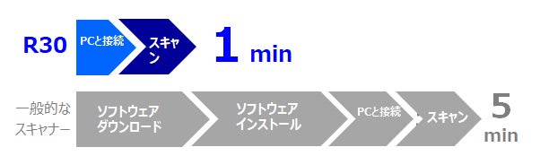“imageFORMULA R30”はキヤノン電子の特許技術により、スキャナー本体にソフトウエアが内蔵されているため、一般的なスキャナーとは異なりドライバーやソフトウエアをパソコンにインストールする必要がありません。付属のUSBケーブルでパソコンと接続し画面に表示されるソフトウエアを選択するだけで、スキャナー本体に内蔵されているソフトウエア「CaptureOnTouch Lite」が起動し、利用を開始できます。利用時にドライバーやソフトウエアをWEBサイトからダウンロードしたり、OSのバージョンアップにより再インストールする手間を省きます。