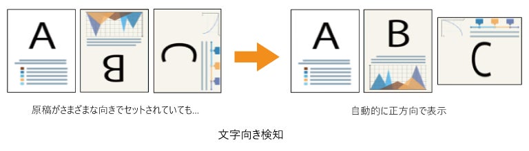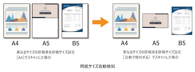 用紙のサイズ、文字の向き、白紙などを自動検知して補正する機能を搭載しており、用紙のサイズや向きが異なる場合や、白紙が混載している場合でも、最適なデータに変換して読み取ります。また請求書やカード、ハガキなど幅広い用紙に対応し、異なる種類の用紙をまとめてセットすることが可能※2で、スキャン前に仕分けを行う時間と手間を削減します。一回の読み込みで両面スキャンが可能で、コンパクトな設計でありながら最大積載枚数は60枚※1です。