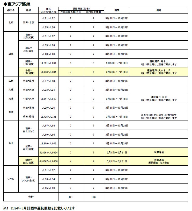 季節毎の増減便、季節運航便につきましては、JAL時刻表またはJAL Webサイトをご確認ください。