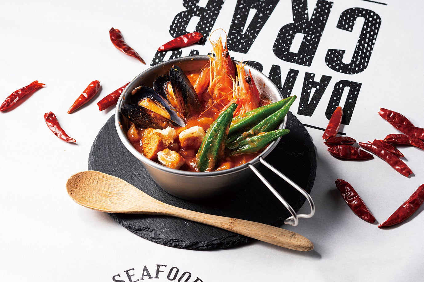アメリカ南部のソウルフード。丁寧に炒めたコク深いブラウンルー仕立ての定番スープ。オクラとシーフードのスパイシーガンボスープ。