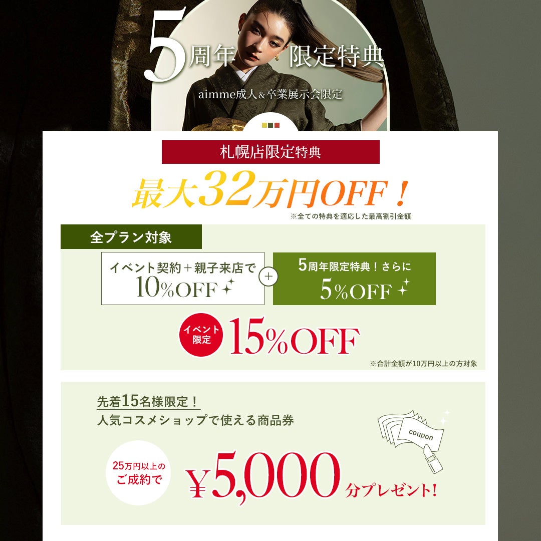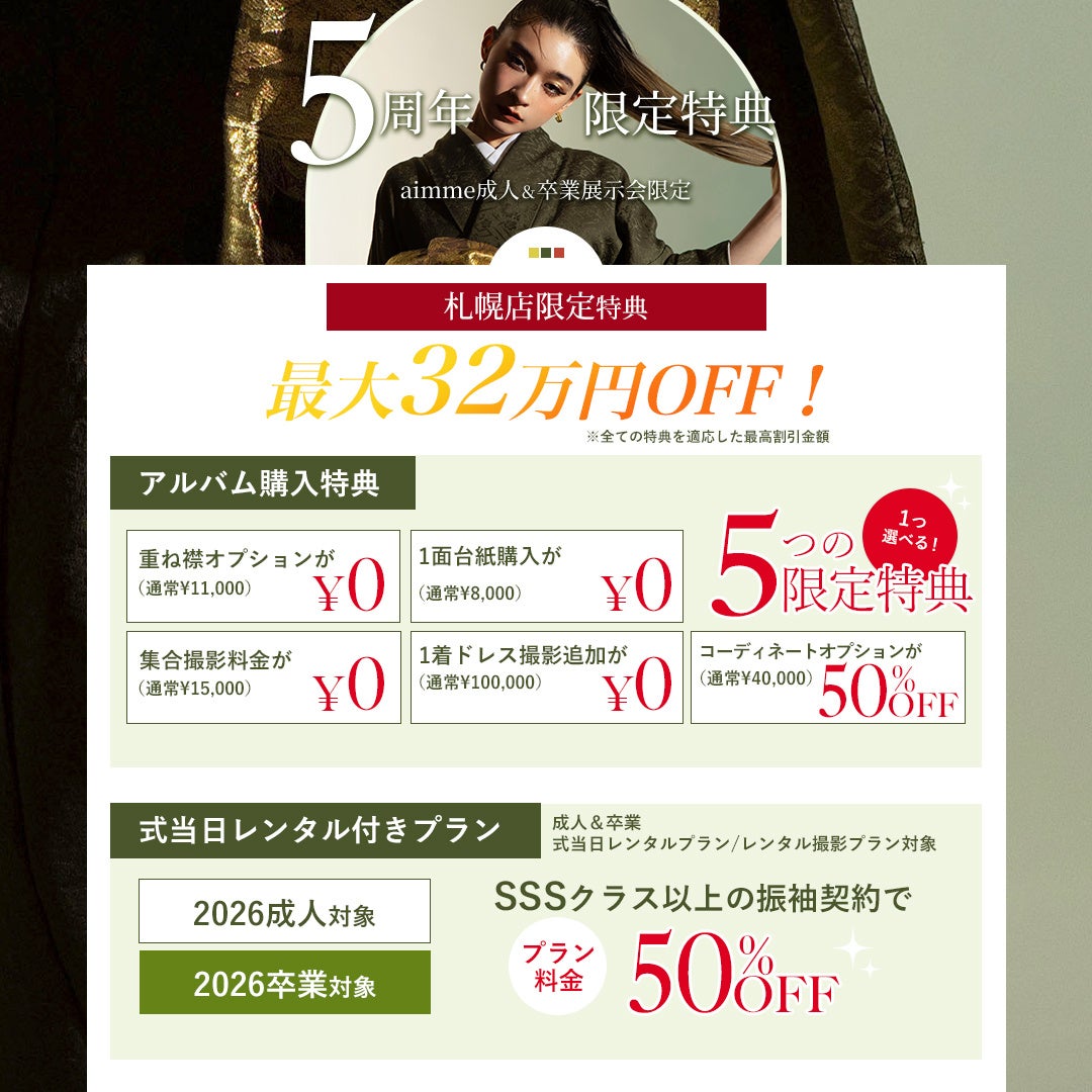 今年で10代から20代女子の支持率NO1フォトスタジオのaimme(エイミー)が5周年を迎えることを記念し、5周年イベント「振袖&卒業袴展示会」の開催が決定。