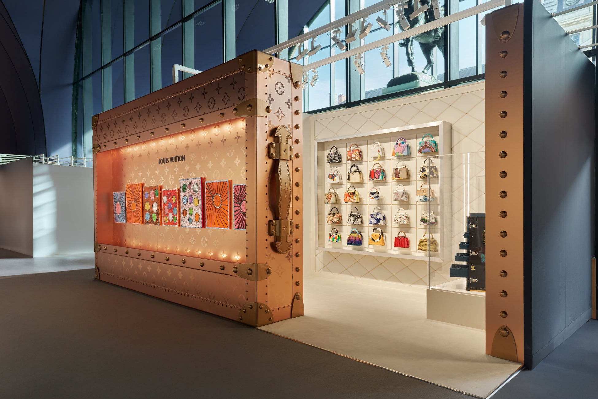 10月20日(金)から22日(日)までグラン・パレ・エフェメールにて開催される「Paris+ par Art Basel 2023」でのルイ・ヴィトンのブースは、メゾンの特大のトランクをイメージしたデザインに。外観は、ルイ・ヴィトンのメンズ クリエイティブ・ディレクター ファレル・ウィリアムスのデビューショーとなった2024春夏メンズ・コレクションのランウェイで発表された「カッパー・マル・クリエ(Copper Malle Courrier)」をインスピレーション源とし、ブースの内壁には、創業者ルイ・ヴィトンが1854年に事業をはじめて以来、トランクのパッド入りの内装として施されてきたアイコニックな「マルタージュ」という、洗練されたひし形の格子模様があしらわれています。本ブースは、村上隆とのコラボレーションによるバッグやキャンバス、ダミアン・ハーストによるユニークなトラベルトランクのリメイク、スティーブン・スプラウスによるローズ・モチーフをあしらったバッグ「アルマ」など、世界的に著名なアーティストたちによるキュレーション作品を展示するための完璧なショーケースとなっています。その他のオリジナル作品としては、リチャード・プリンスによるペインティング3点、村上隆によるペインティング1点、ヤン・ペイミンによる若き日のルイ・ヴィトンをイメージして描いた円形のポートレート、レフィーク・アナドールが人工知能(AI)を駆使してルイ・ヴィトンを描いた「Finding LV(ルイを見つけて)」などを展示。また、今回初公開となる草間彌生による最新作7点「EVERY DAY I PRAY FOR LOVE(毎日愛について祈っている)」も登場。このフレーズは、2022年の草間とルイ・ヴィトンとの最新コラボレーションの構想中に制作がはじまったこの新シリーズを含め、草間の直近の絵画群の背面に繰り返し記されるようになったものです。
