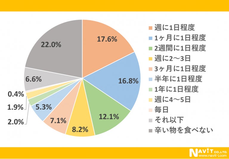 辛い料理を食べる頻度は「週に1度程度」が最も多くて17.6%。「2週間に1日程度」(12.1%)、「1カ月に1日程度」(16.8%)の合計で回答者の4割近くを占めています。「毎日」食べる人は少なくて、0.4%にとどまっています。