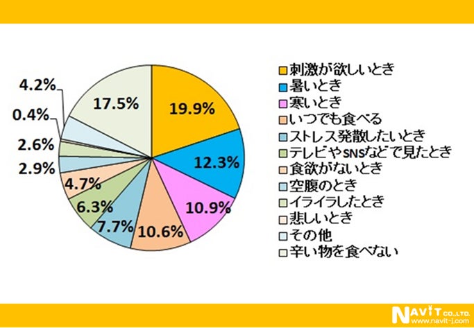 辛い料理を食べたくなるのはどんなときか複数回答可でアンケートをとったところ、「刺激が欲しいとき」が一番多く、総回答数(1593回答)の19.9%で318人でした。2、3位は「暑いとき」(12.3%、196人)と「寒いとき」(10.9%、174人)で、「暑いとき」が「寒いとき」を上回っています。