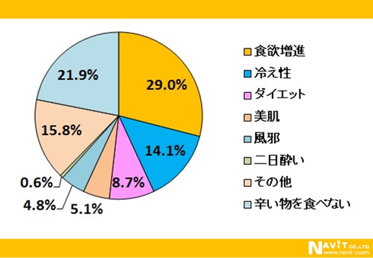 アンケートにも出てきますが、暑いときに辛い料理が好まれるのも食欲増進効果があるからなのです。日本に限らず、インドやタイ、スリランカなど暑い国で辛い料理が多いのもうなずけますね。