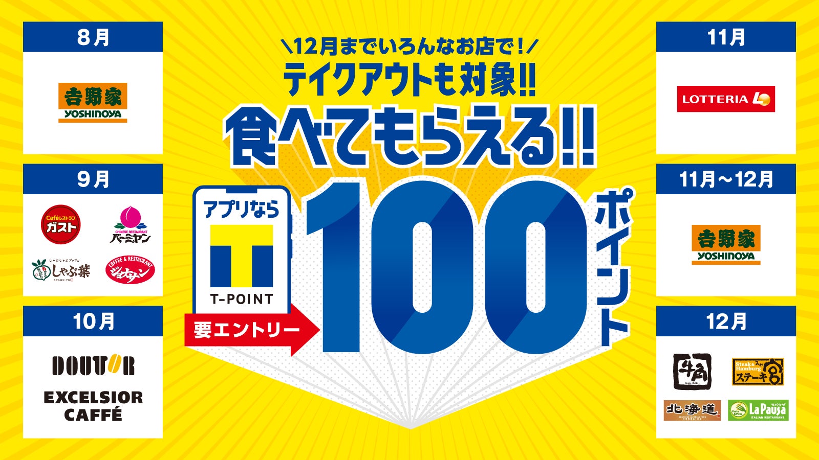 本キャンペーンでは、期間中にエントリーページよりエントリーしていただき、対象店舗でのお会計時に「モバイルTカード」をご提示いただくと、1日あたり100ポイントを進呈いたします(おひとりさま1日1回、期間中10回まで、最大1,000ポイント)。対象店舗は毎月順次変更となり、8月は「吉野家」、9月は「すかいらーくグループ」、10月は「ドトールコーヒーグループ」、11月は「ロッテリア」、11月から12月までの約2か月間は再び「吉野家」、12月は「牛角」「ステーキ宮」「北海道」「ラパウザ」といった、有名外食チェーンでそれぞれ開催いたします。キャンペーン対象店舗について、詳しくはキャンペーンページよりご確認ください。なお、テイクアウトのお会計も対象です。
