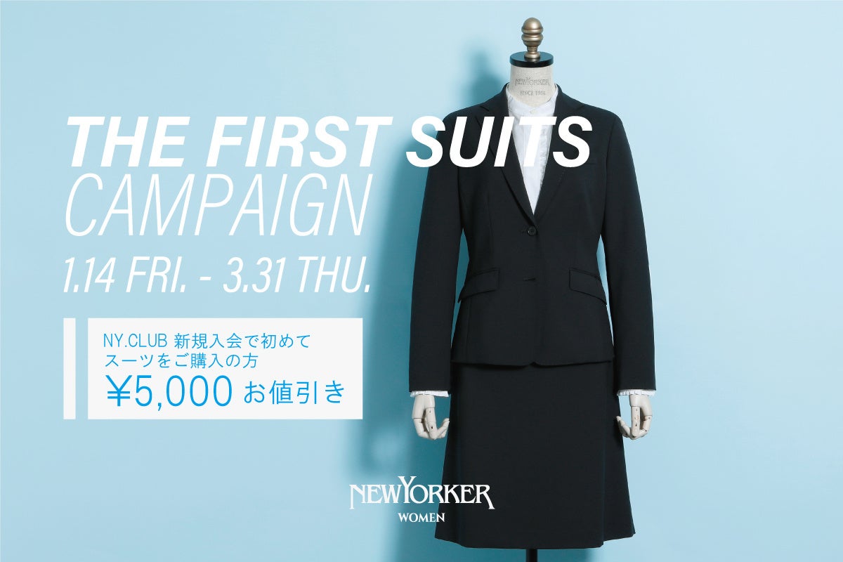 衣料事業の主力ブランドNEWYORKERを中心とした衣料服飾品の企画、製造、販売、不動産の売買、仲介、賃貸管理を行っている株式会社ダイドーフォワード(本社:東京都千代田区/代表取締役:鍋割 宰)は、 1月14日(金)~3月31日(木)の期間、学生の方や新社会人、働く女性を対象に、「THE FIRST SUITS CAMPAIGN!/ザ ファーストスーツキャンペーン」を開催いたします。