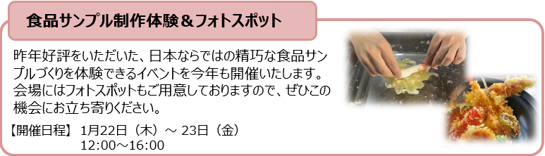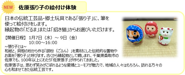 1月は、千葉県香取市で受け継がれる郷土玩具『佐原張り子』の絵付け体験と、昨年も多くのお客様に好評をいただいた思わず本物と見まがう食品サンプルの制作体験をお楽しみいただきます。
