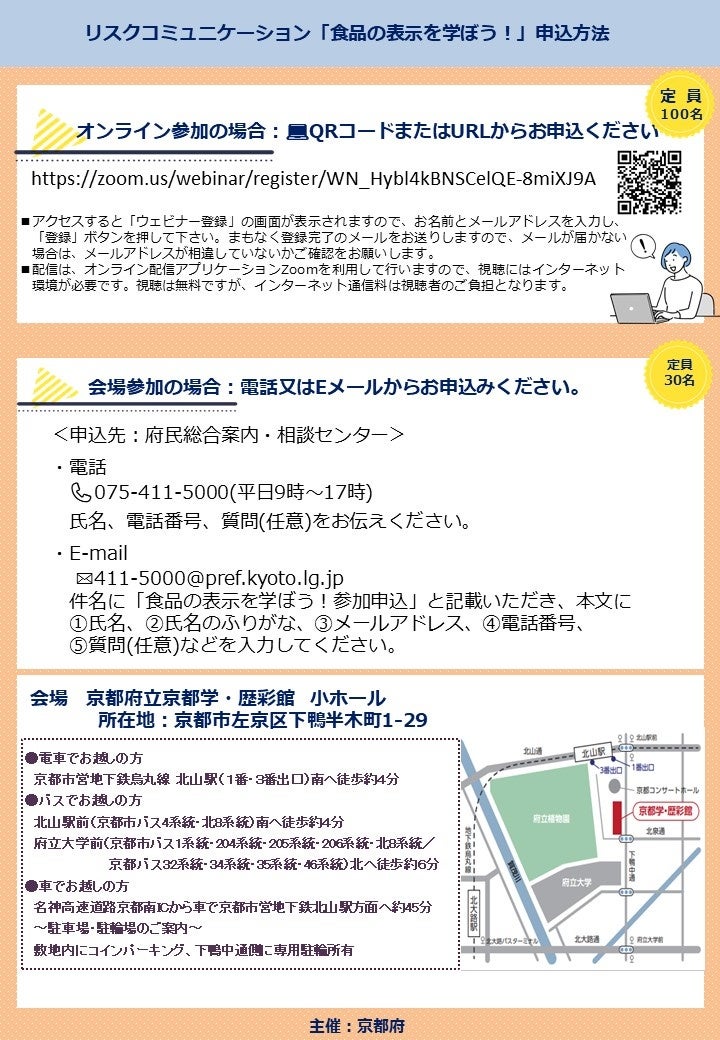 ■京都府では、府民の皆様が正しく食品を理解して適切に選択し購入できるように、講習会(リスクコミュニケーション)「食品の表示を学ぼう!」を1月24日に開催します。