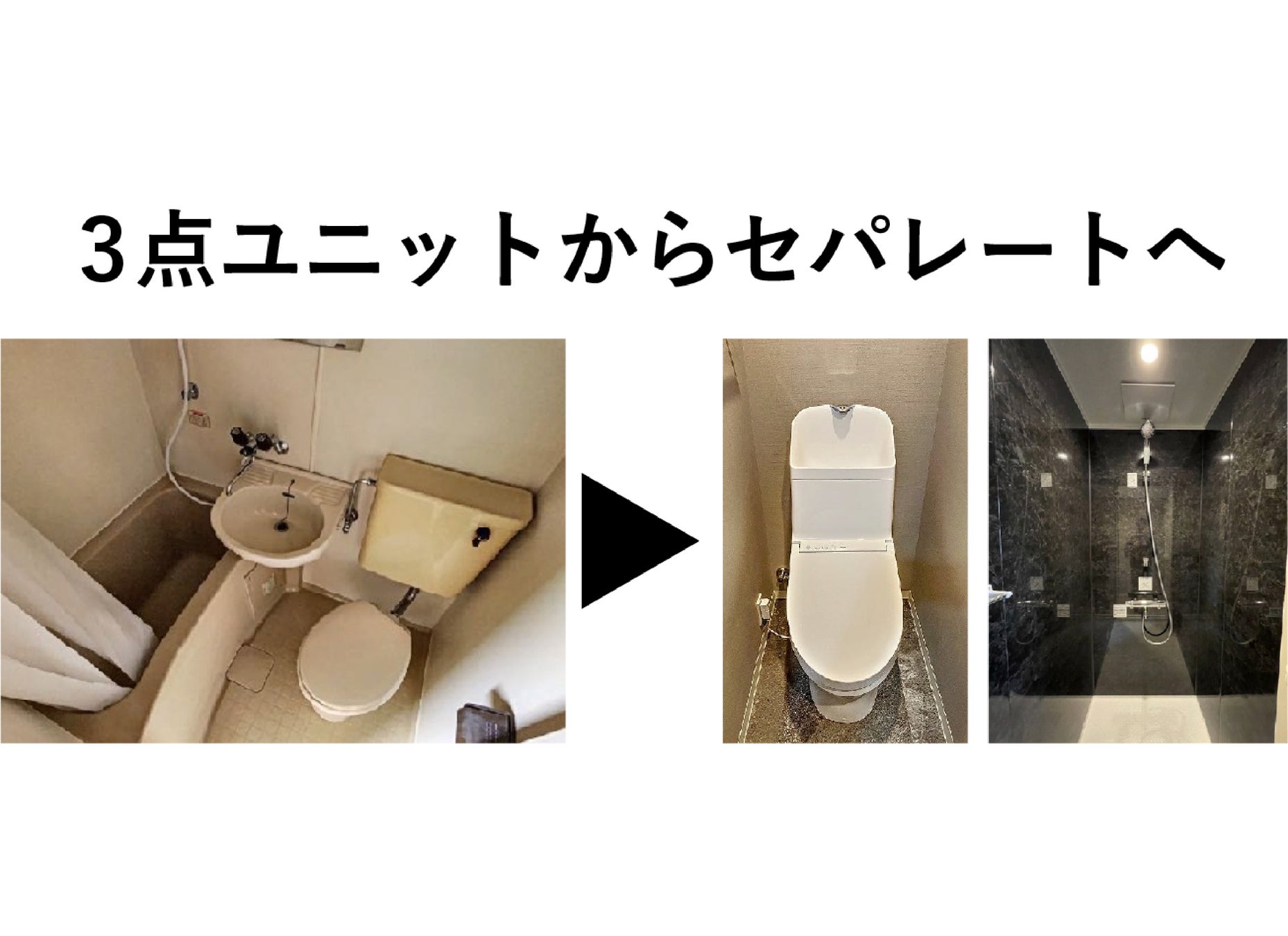 浴槽を必要としない現代の若年層ニーズから、不人気の原因となりやすい3点ユニットバスを、スタイリッシュなシャワーブースへと変更することで、物件の魅力を向上させています。