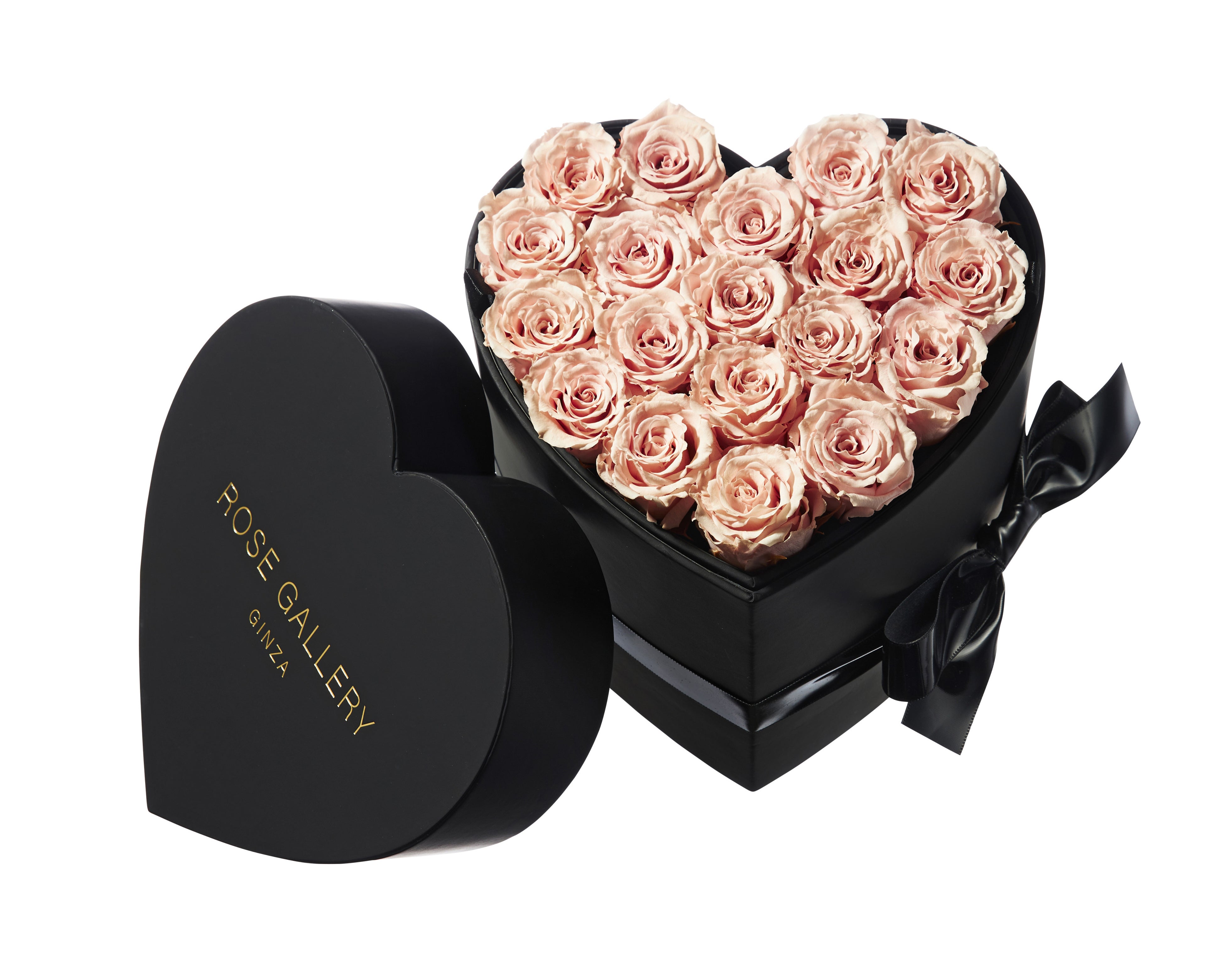 見る人を笑顔にするローズアレンジ。 ローズの下にはアイテムを入れられる空間が。「ローズギャラリー」カムアップローゼス・ハート(M)49,500円