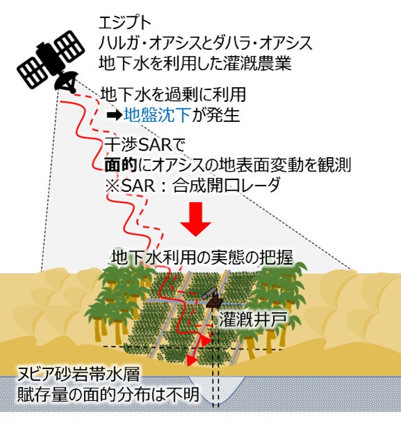 そこで研究グループは、世界中で地下水の過剰な揚水と密接に関連する地盤沈下に着目し、地表で観測される地盤沈下から地下の情報である地下水の状態を間接的にモニタリングできないかと考えました。これまで、オアシスにおいては建物が傾くといったような大規模な地盤沈下は発生していないため、オアシスにおける地盤沈下に関する研究は報告されていません。しかし、合成開口レーダー(SAR)を使った衛星リモートセンシング技術の1つである干渉SAR技術を用いれば、地表面の微小な変化であっても高精度に観測することができるため、地盤沈下を発見できる可能性があります(図1)。