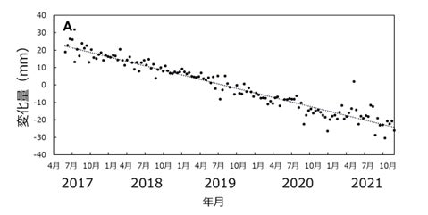 研究グループは、2017年から2021年の約5年間の衛星観測データから干渉SARを用いた時系列解析を行いました。これにより解析期間中にハルガおよびダハラの両オアシスにおいて、約10mm/年の速度で地表面が下降していることを観測することができました(図2)。