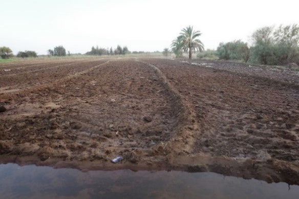 本研究は、干渉SARによる衛星データ解析により、オアシスにおいて局所的な地盤沈下が発生していること、またそれを地図として見える化した世界で初めての成果です。地盤沈下の主な要因としては、地下水利用が密接に関わっている可能性があります。現地では水路から水を引く伝統的な水盤灌漑(注4)が行われています(写真1、 2)。灌漑農地では、わずかな地表面の高さの違いで水が溜まりやすい場所が形成され、そのような場所ではWaterlogging(注5)によって土壌に塩類が集積し、農業生産性が著しく低下することが課題となっています。今回検出された地盤沈下の速度は年数mm程度ですが、沈下は不均一であるため沈下の大きな場所は水が溜まりやすくWaterloggingが発生する危険性が高まると予想されます。また今後は、現地の地下水位や揚水量のデータと本研究の結果を統合することによって、地下水位低下と地盤沈下の関係をより明確に把握し、人工衛星の観測データから面的かつ高解像度な地下水のモニタリングが可能になると考えています。