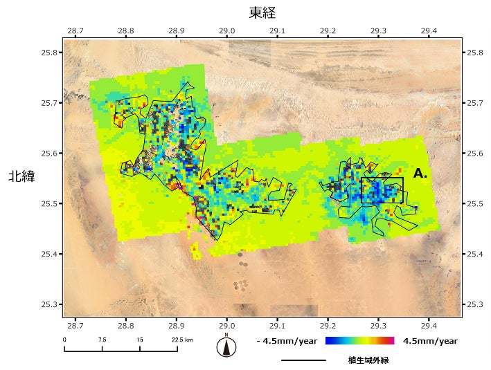 千葉大学大学院園芸学研究科博士前期課程2年の黒上京太郎氏、千葉大学大学院園芸学研究院の濱侃助教、松岡延浩教授、上智大学外国語学部フランス語学科の岩崎えり奈教授らによる研究グループは、合成開口レーダー(SAR)(注1)の観測データを解析し、エジプトのナイル川以西の広大な砂漠にあるハルガ(Kharga)およびダハラ(Dakhla)オアシスで地盤沈下が発生していることを発見しました。この地域は年降水量が0mmの極乾燥地域で、オアシスは世界最大級の帯水層とされるヌビア砂岩帯水層の地下水に依存した生活を送っています。顕著な沈下はオアシスの農地に見られたことから、灌漑用の地下水利用がその原因と考えられ、今回対象としたオアシスと同様に乾燥地に位置し、地下水に依存している世界中のオアシスで同様の現象が発生している可能性があります。本研究成果は、地上からは見ることができない地下水の状態や利用状況を広域に評価する新手法となる可能性があります。
