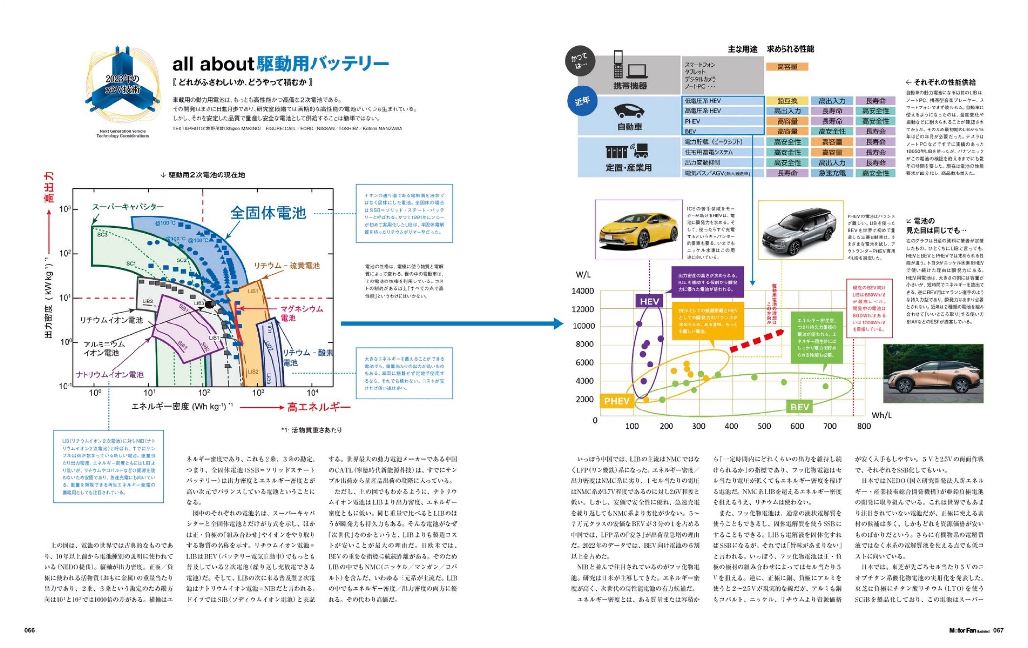 3章の「2023年のxEV技術」より。冒頭は、やはり気になる駆動用バッテリーの動向をまとめました。リチウムイオンという主役級に対する強烈なLFPという存在。東芝が先日発表した5V級の新型電池に欧州が進めるナトリウムイオン電池――まさに電池戦国時代ともいえる昨今、自動車にとってふさわしい電池を考えました。
