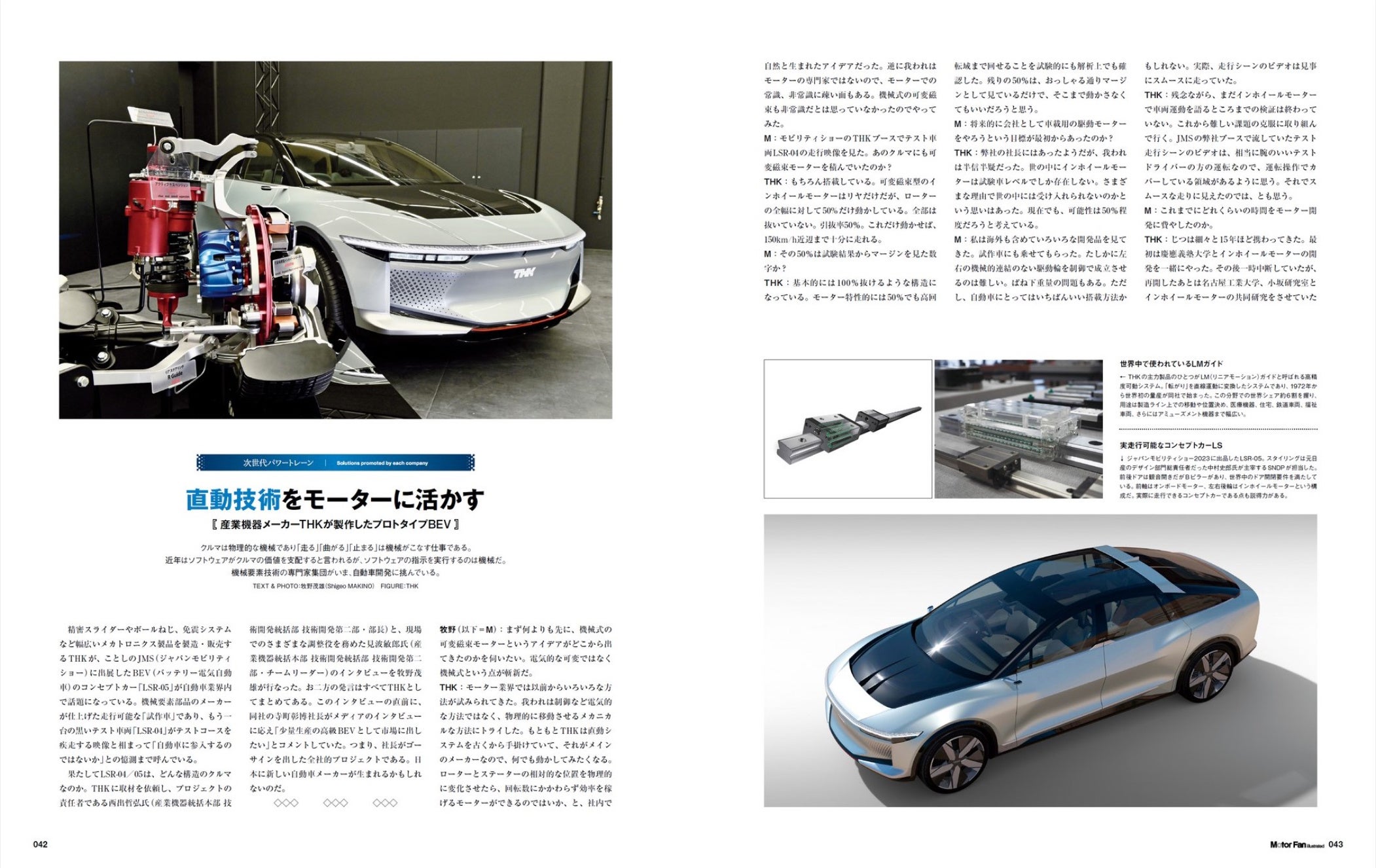 2章ではTHKのプロトタイプEV・LSR-05が積むパワートレーン技術についても紹介しています。JMSではある意味最大の注目だったこのクルマのさまざまなシステムを、開発エンジニアにあらためて取材、詳しくお話をうかがいました。