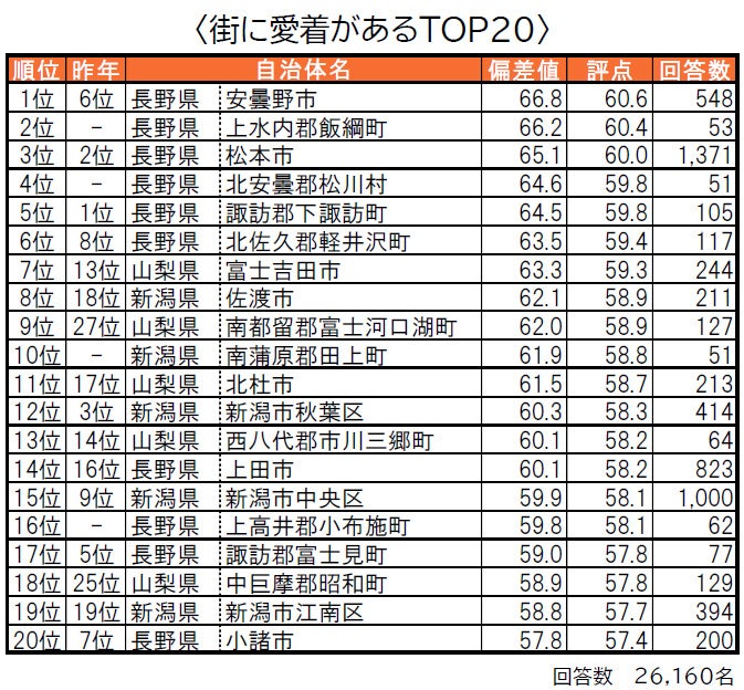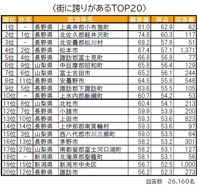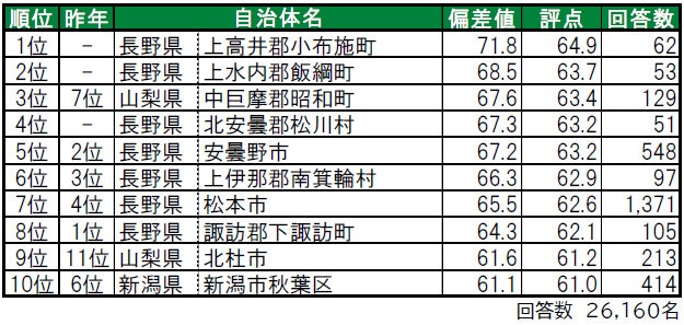 1位は唯一偏差値70台の高い評価を得ている上高井郡小布施町、2位は上水内郡飯綱町で、いずれも昨年は累計回答数が50名未満でランキング集計対象外だった長野県の町です。3位は、山梨県中巨摩郡昭和町です。また、長野県北安曇郡松川村が新たに4位にランクインしています。