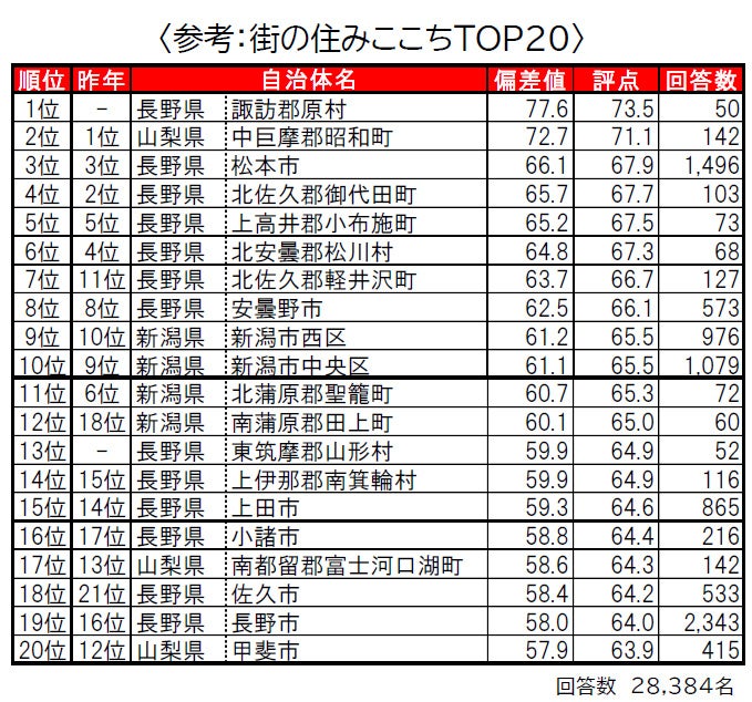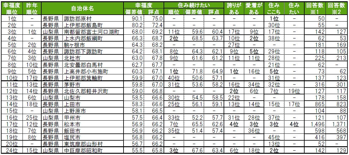 いい部屋ネット「街の幸福度 & 住み続けたい街ランキング2023<甲信越版>」(街の住みここちランキング特別集計)発表