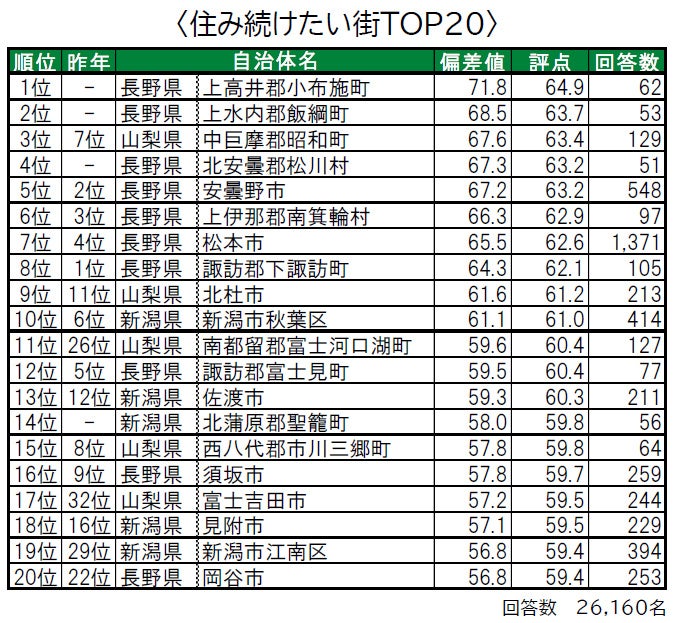 住み続けたい街は、1位長野県上高井郡小布施町、2位長野県上水内郡飯綱町、3位山梨県中巨摩郡昭和町。