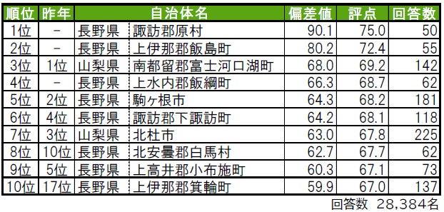 1位は長野県諏訪郡原村で、唯一偏差値90台の極めて高い評価を得ており、「住みここち」でも1位です。2位は長野県上伊那郡飯島町で、偏差値80台の非常に高い評価でした。トップ2は昨年まで累計回答数50名未満でランキング集計対象外だった長野県の自治体です。3位は山梨県南都留郡富士河口湖町です。トップ10内では、4位に長野県上水内郡飯綱町、10位に長野県上伊那郡箕輪町が新登場で、トップ10のうち8つが長野県の自治体となっています。