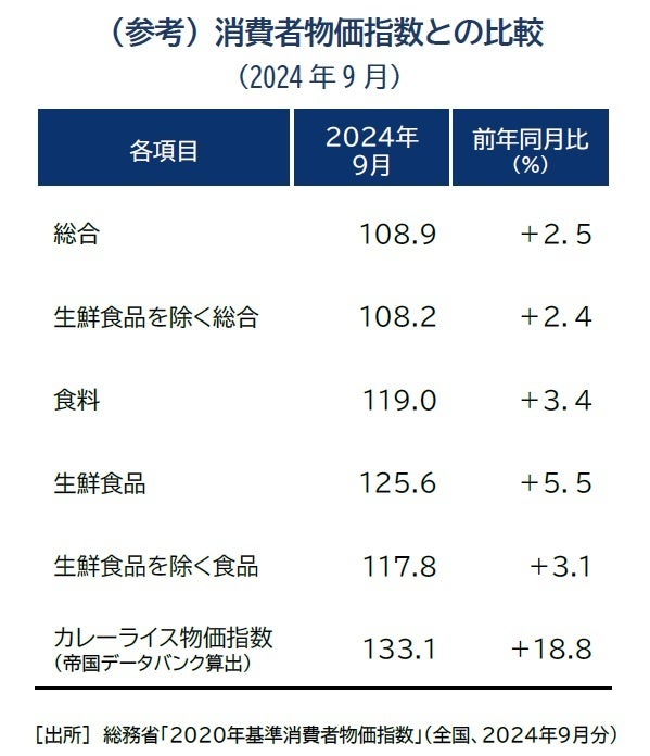 カレーライス物価を基に、2020年平均を100とした独自算出の「カレーライス物価指数」をみると、2024年9月の指数は133.1となり、5年間で3割を超える上昇率となった。同指数の前年同月比では18.8%上昇し、16カ月連続のプラスとなった。