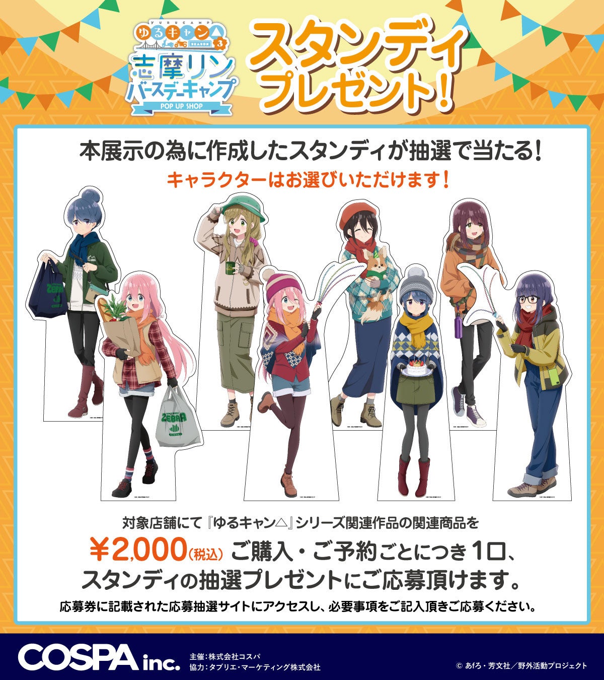 開催期間中、会場にて『ゆるキャン△』シリーズ関連作品のグッズを2,000円(税込)ご購入につき1口、スタンディの抽選プレゼントにご応募いただけます。