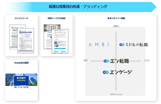 プレスリリースや特設ページ、Web広告での告知に加え、各求人サイトでの集客支援を実施。『エン転職』『エンゲージ』『AMBI』『ミドルの転職』とターゲットの異なる求人サイトを活用することで、ターゲットへ網羅的に求人を届けます。