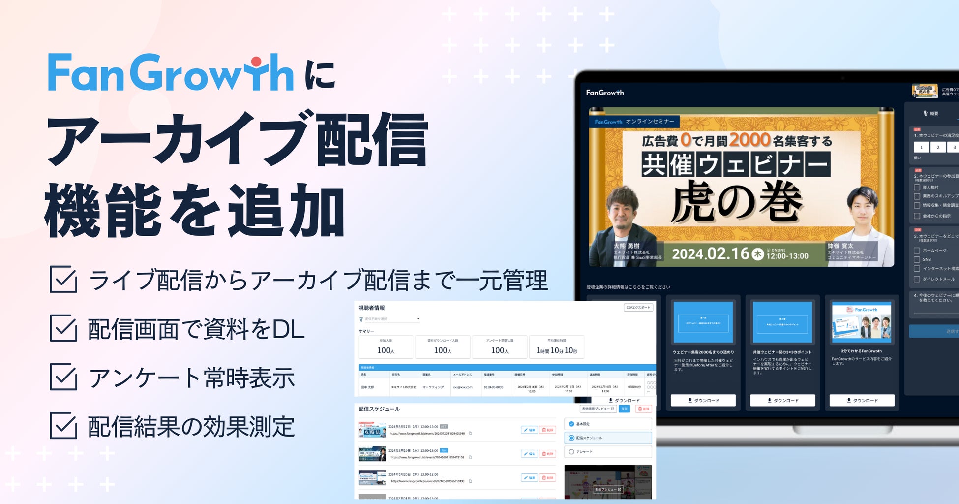 ウェビナーPDCAクラウド「FanGrowth」、アーカイブ配信機能を追加。ウェビナー開催後の効果的なアーカイブ配信が可能に