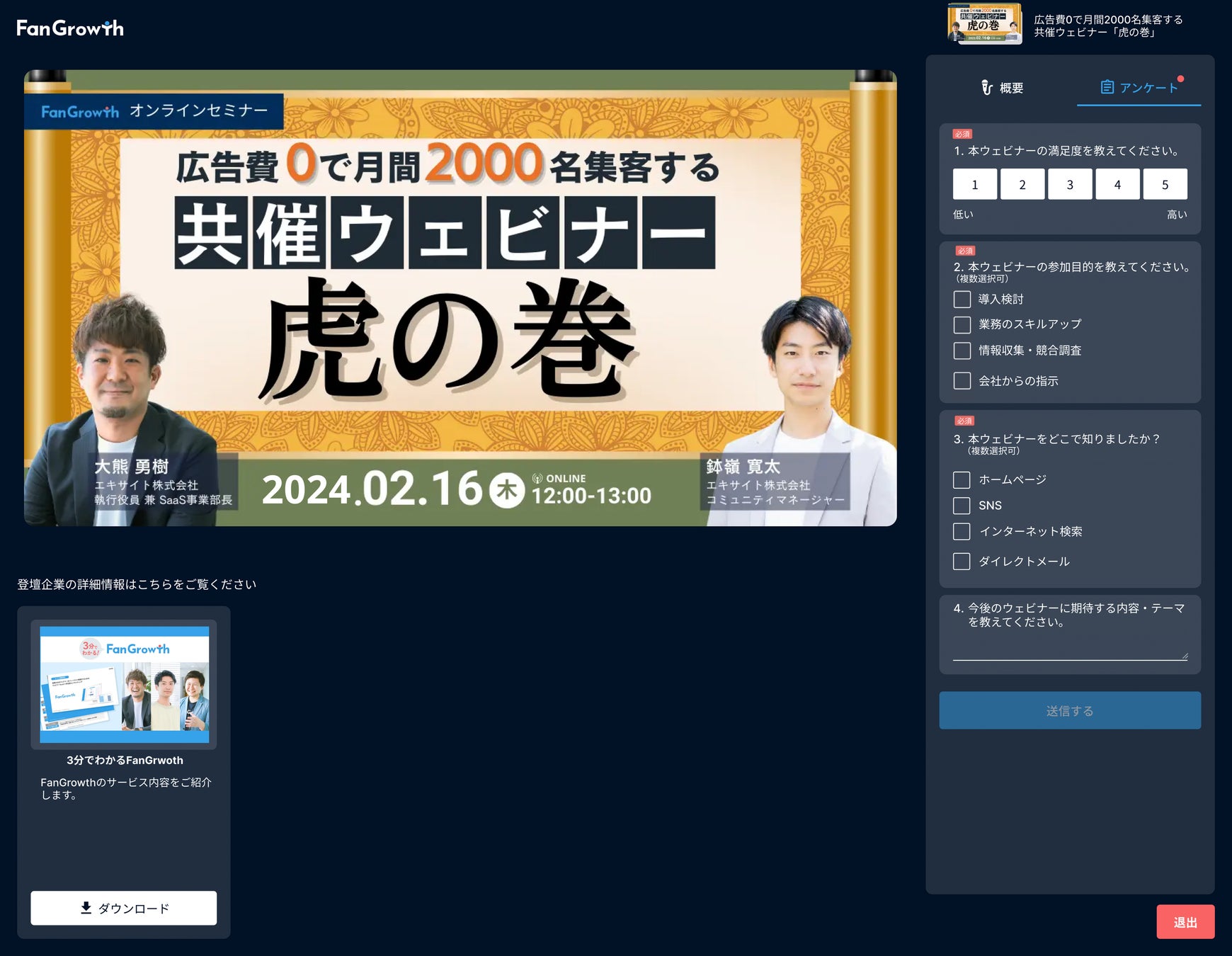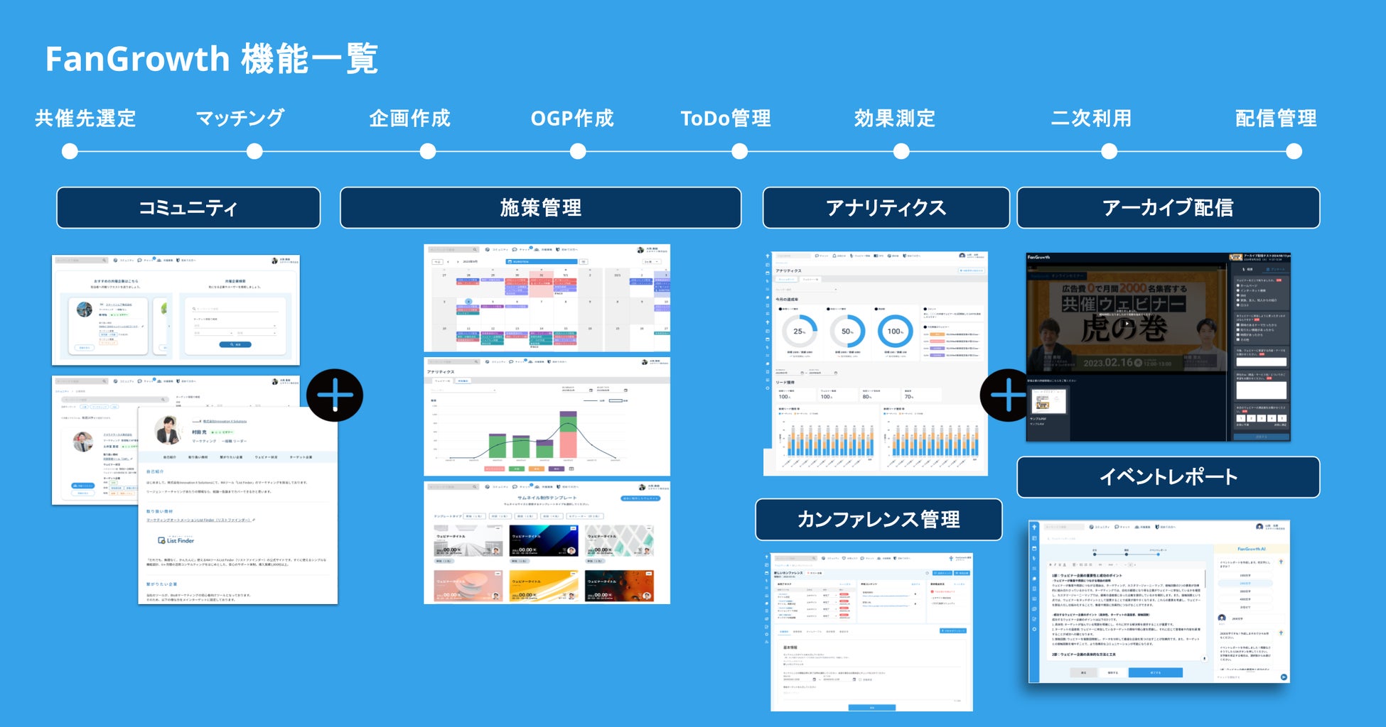 また、従来のウェビナーの共催先選定や企画の自動作成に加え、配信後のアーカイブ配信、アンケート回収、メール配信までの一連のプロセスをFanGrowthが一手に担い、最小限の工数で効果的なウェビナーの実施が可能になります。